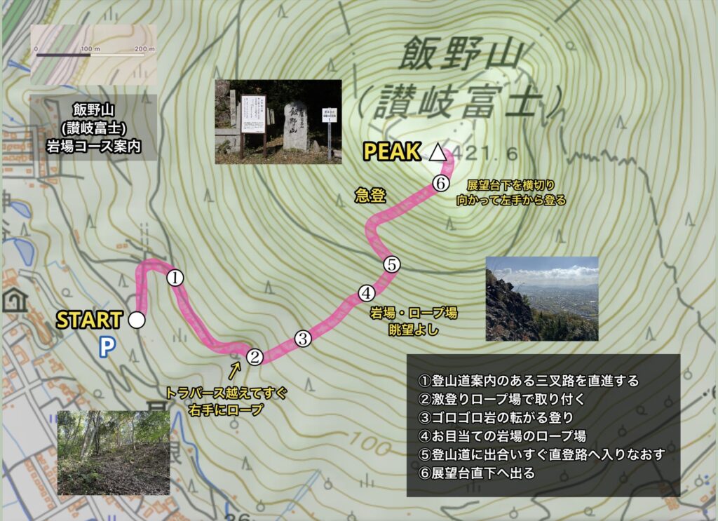 今回の記事で歩くのは、飯野町登山口からスタートして岩場を直登して展望台下へと登り切る通称 飯野山岩場コースです。