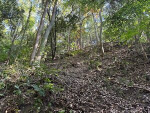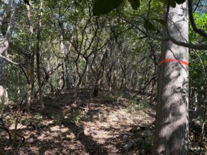 香川県砂防指定地の石標を目印に、トラバースして谷を越えたら左手へ取りつきます。