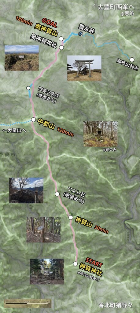 今回の記事では前者、神賀山から奥神賀山を目指して縦走するコースで歩いてみました。