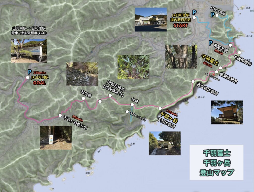それでは、日和佐駅から千羽富士・千羽ヶ岳を経て山河内駅まで歩きます。