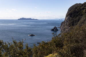 切り立った崖が続く一帯の海岸線は千羽海崖(せんばかいがい) と呼ばれ、特に最高地点の千羽ヶ岳においてはほぼ垂直の245mの大岩壁。