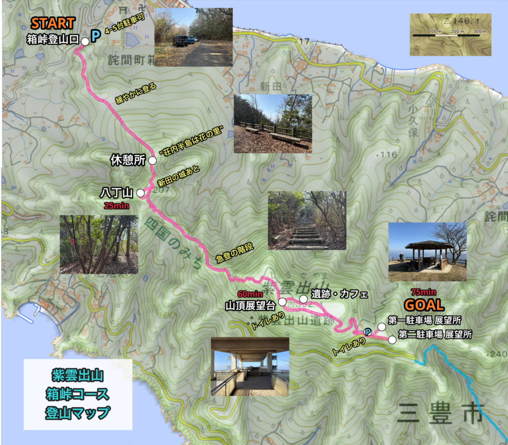 紫雲出山は本記事で紹介した箱峠以外からも、大浜漁港から南面の四国のみちを歩くコースでも登れます。